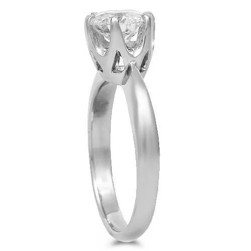 This glamorous diamond solitaire engagement ring is handcrafted in lustrous Platinum. The center is prong set with one brilliant round cut diamond which weighs 1.13 carats. The frame measures to 8 mm in width and weighs 5.7 grams.DETAILS:
