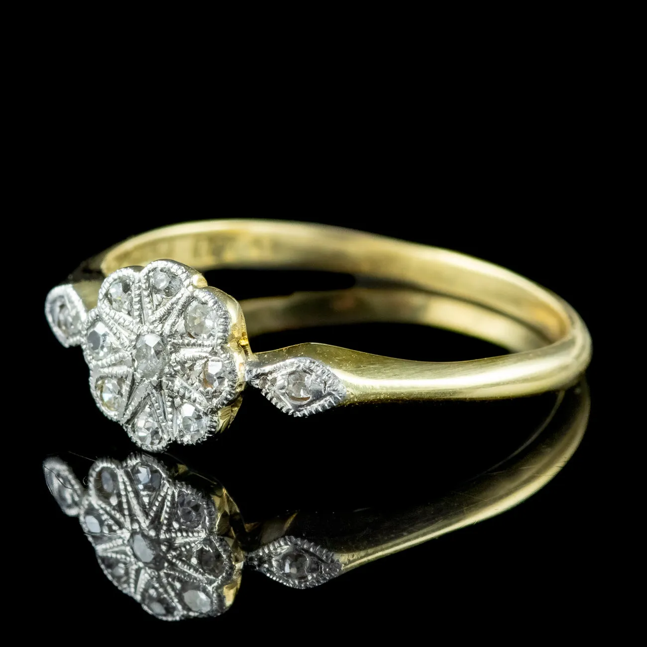 A sweet antique Edwardian daisy cluster ring from the early 20th Century dotted with nine twinkling diamond petals and an additional one on each shoulder, approx. 0.10ct total.
