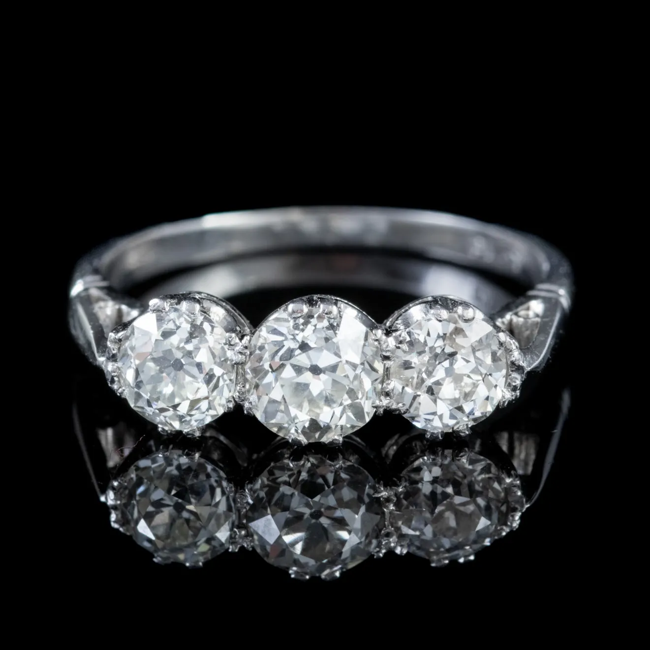 This stunning Antique Diamond Trilogy ring was made Circa 1918. The piece is adorned with three spectacular claw set old European cut Diamonds mounted in a solid Platinum gallery.