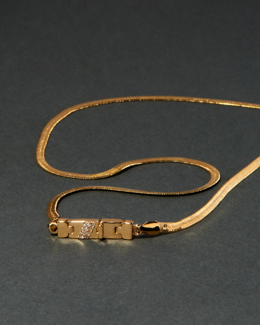 - Thin herringbone chain necklace featuring CZ stone detail on clasp