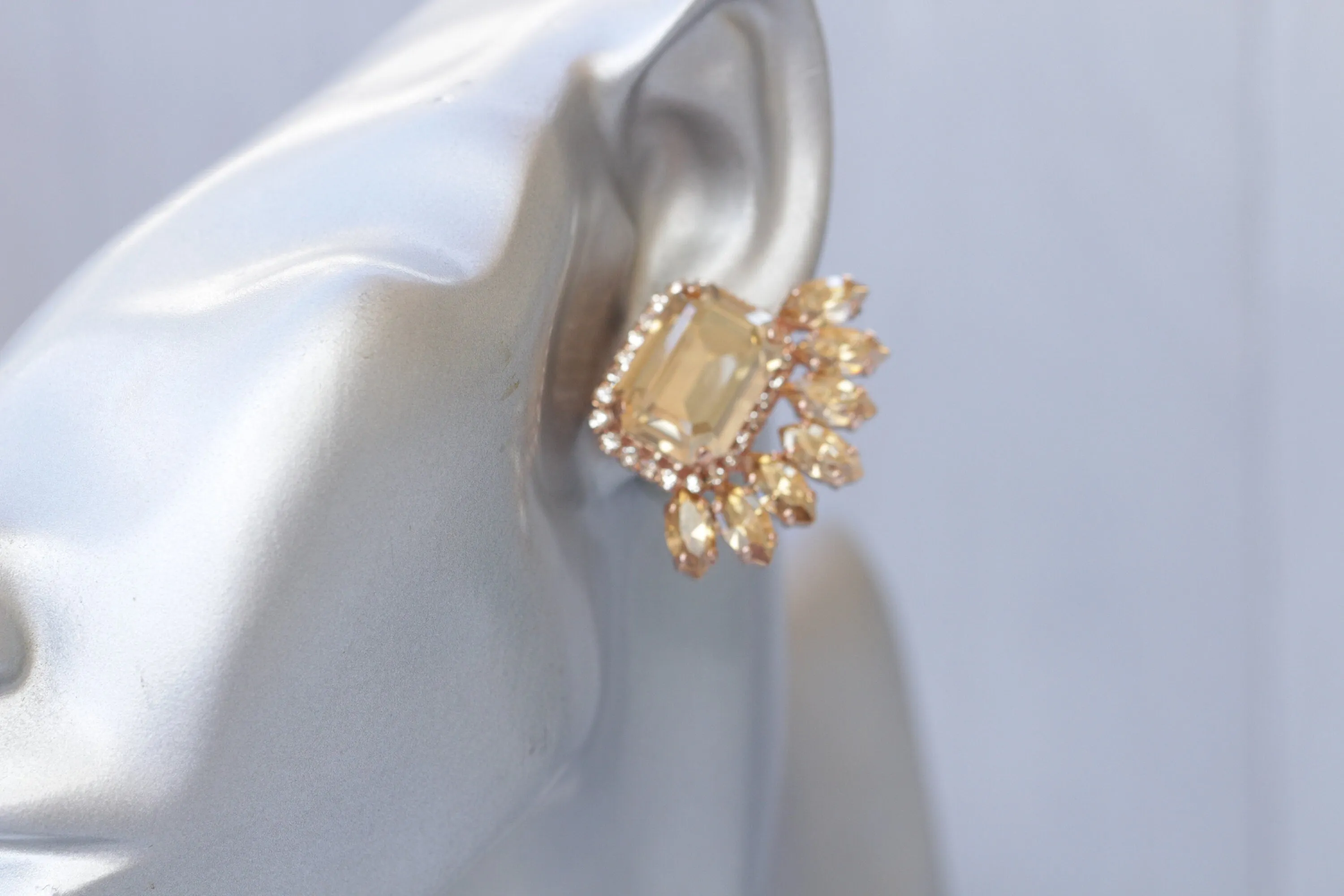 CHAMPAGNE WEDDING EARRINGS, Bridal Topaz Earrings, Statement Earrings, Rose Gold Big Earrings, Cluster Studs, Evening Jewelry, Leaf Earrings
