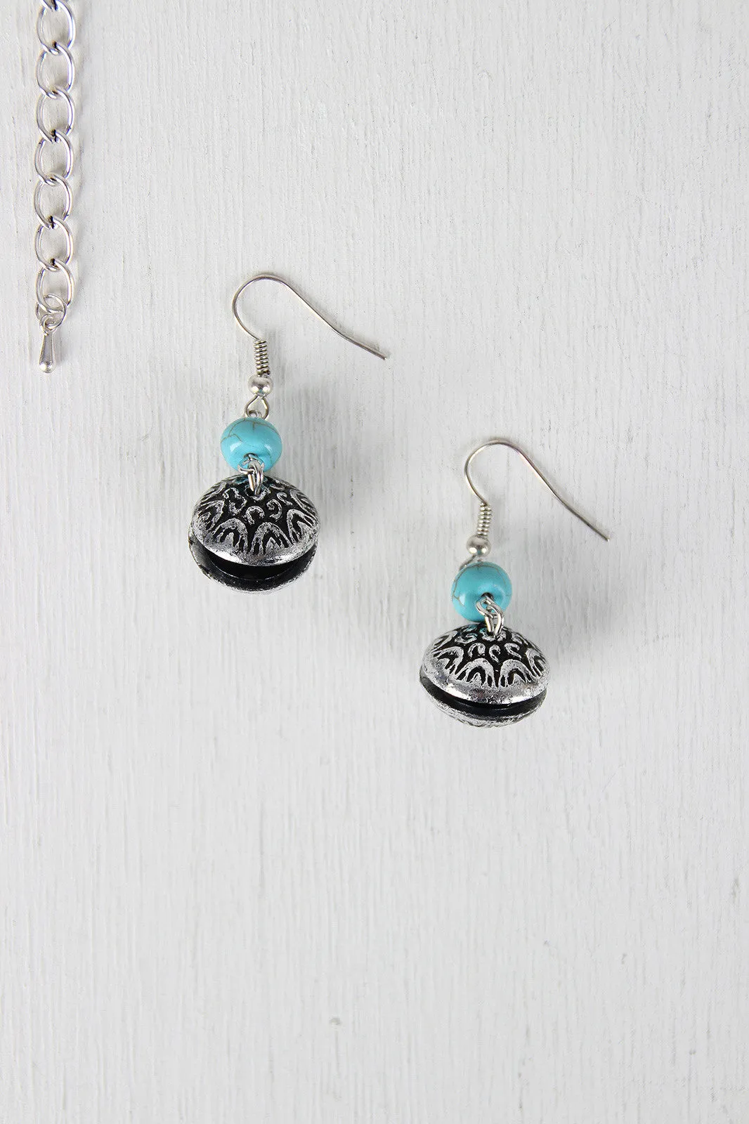 This ethnic inspired statement necklace features a multi strand design, faux turquoise beads, decorative cylinder caps, flattened curb link chain, and etched open sphere beads. Comes with matching earrings.