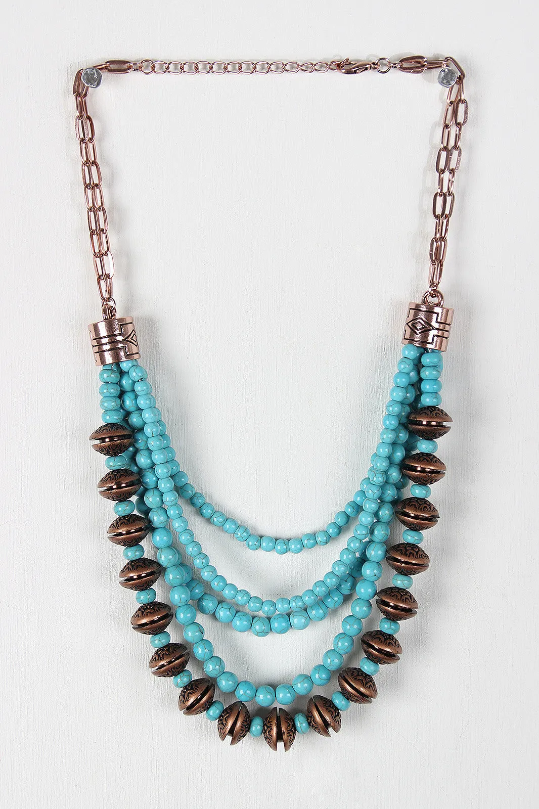 This ethnic inspired statement necklace features a multi strand design, faux turquoise beads, decorative cylinder caps, flattened curb link chain, and etched open sphere beads. Comes with matching earrings.