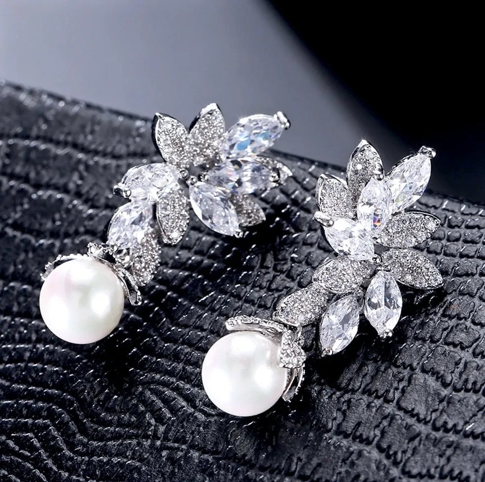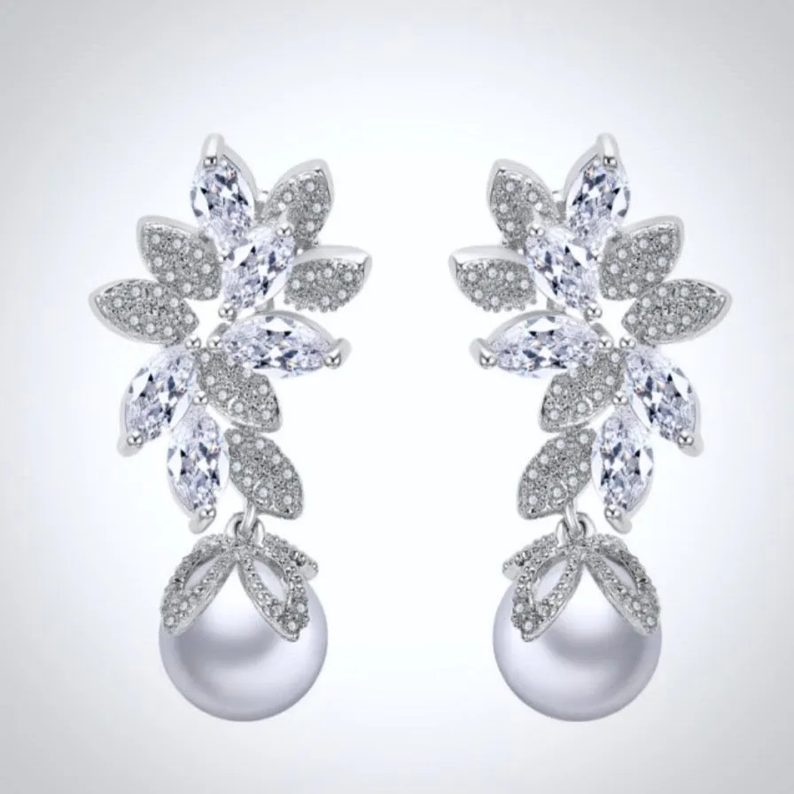Best of both worlds! Iridescent pearls and clear cubic zirconia that capture the light from every angle with a perfectly translucent appeal come together to create a classy, sparkly and thoroughly unique pair of bridal earrings. The settings are rhodium / rose gold / yellow gold plated for a bright finish which enhances the intricate detailing and conveys a modern take on old elegance.