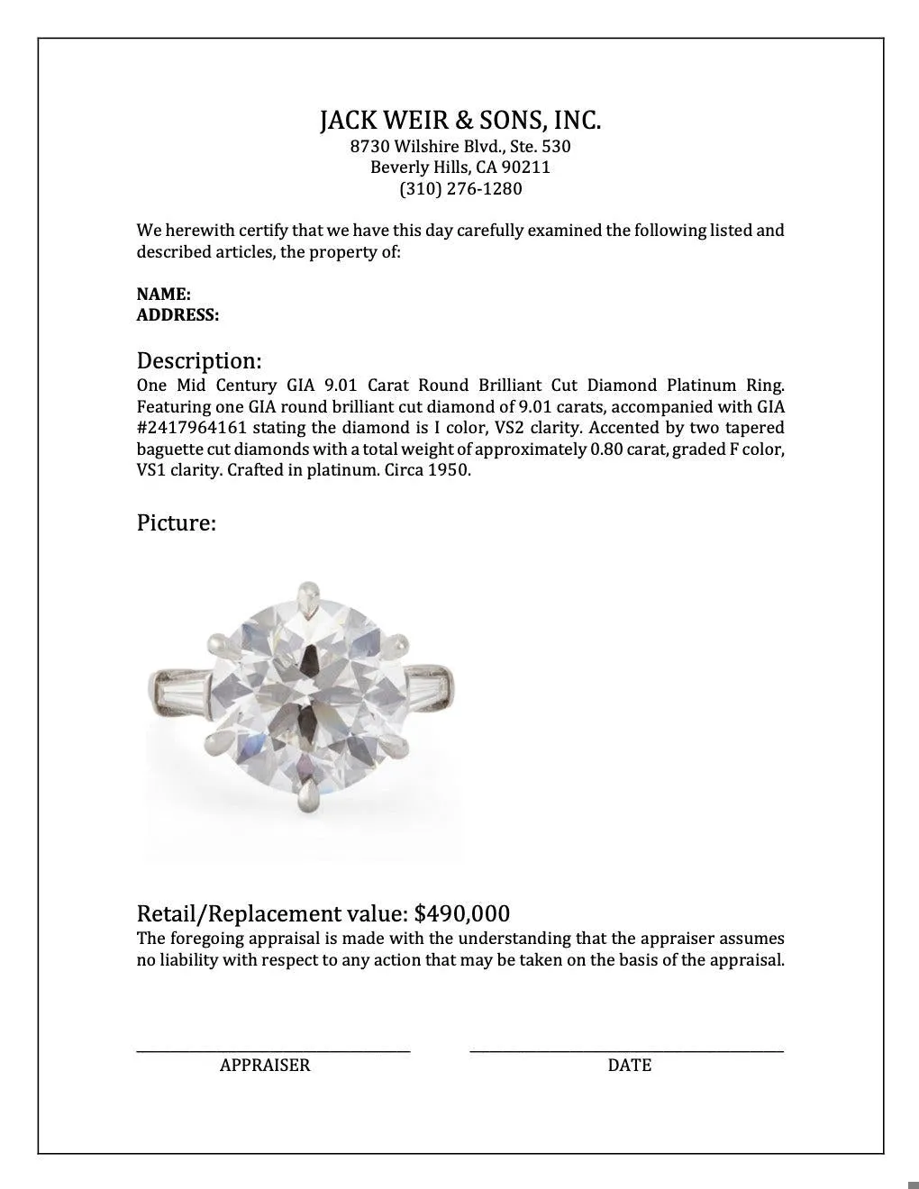 One Mid Century GIA 9.01 Carat Round Brilliant Cut Diamond Platinum Ring. Featuring one GIA round brilliant cut diamond of 9.01 carats, accompanied with GIA #2417964161 stating the diamond is I color, VS2 clarity. Accented by two tapered baguette cut diamonds with a total weight of approximately 0.80 carat, graded F color, VS1 clarity. Crafted in platinum. Circa 1950. The ring is a size 6 1/4 and may be resized.
