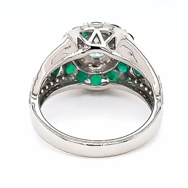 Platinum delicate engagement ring set with center diamond .45 ct F color VVS clarity and 1.09 ct emeralds around the center with pave diamonds.70 ct on the sides.