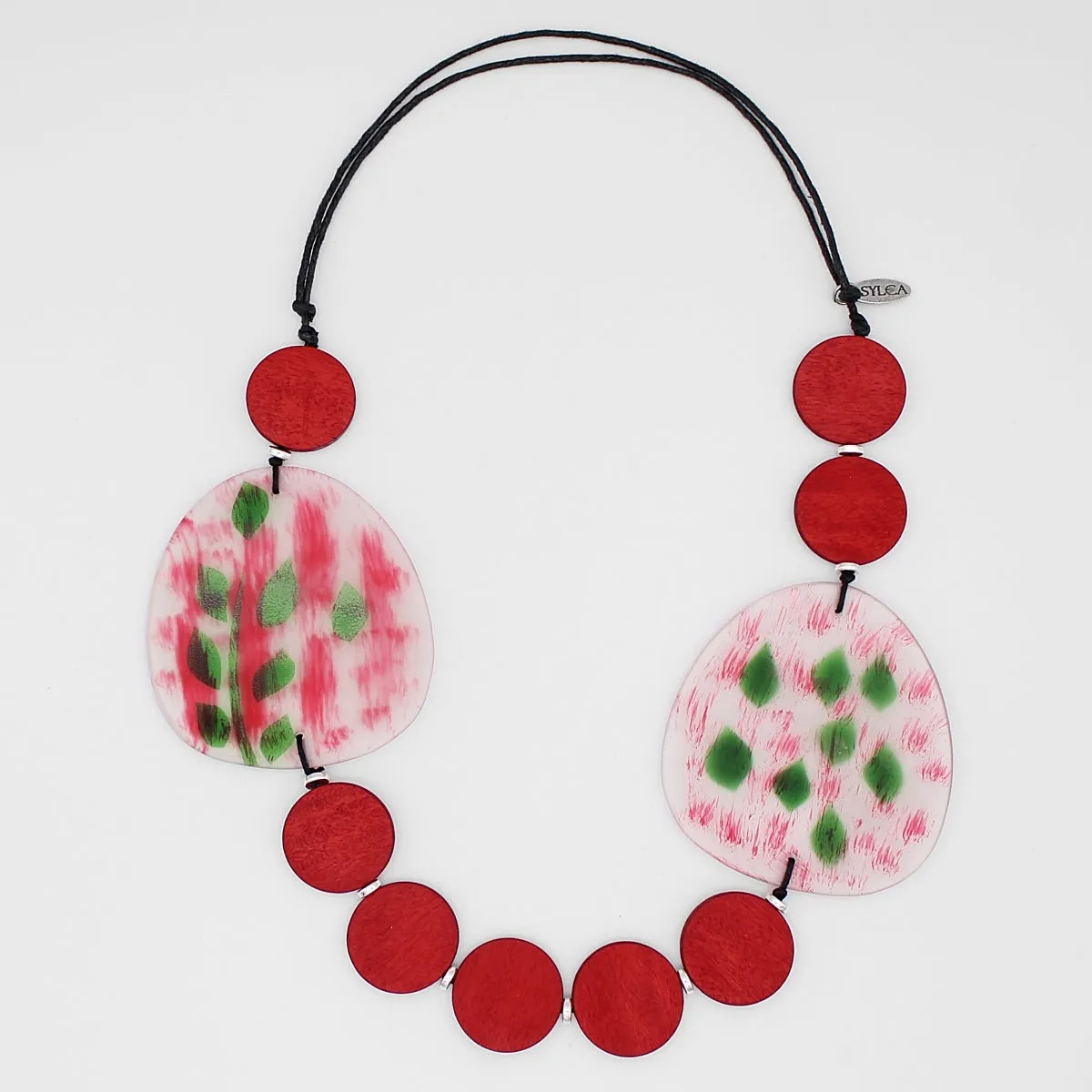 Handcrafted in house; this necklace is a wearable piece of art. Each frosted resin bead is hand painted and strung together along side wood beads on an adjustable black wax cord. This necklace can easily be dressed down for a more casual look, or worn with a dress for a night out.