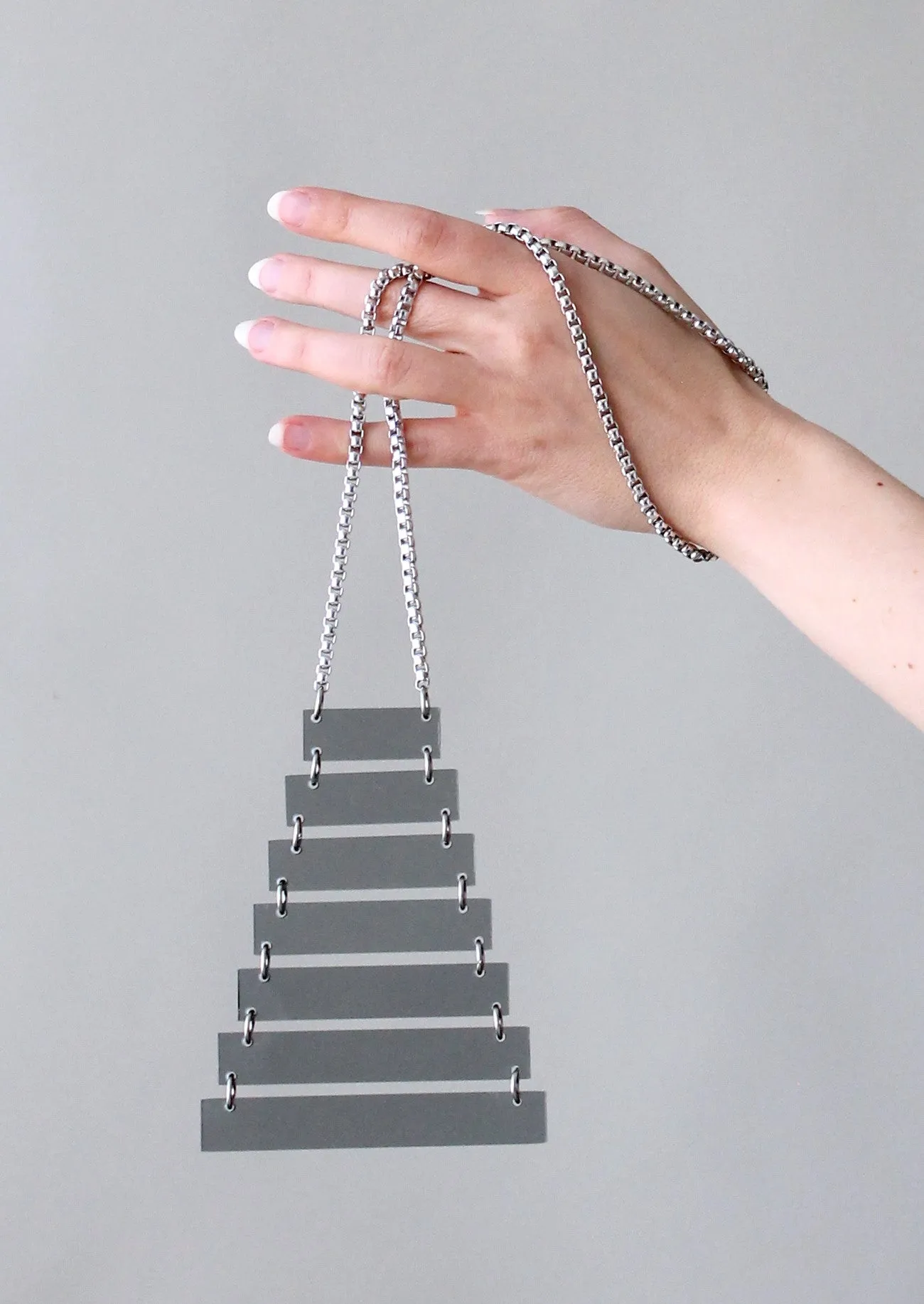 Grey lucite bars with silver-toned links and a serpentine chain.