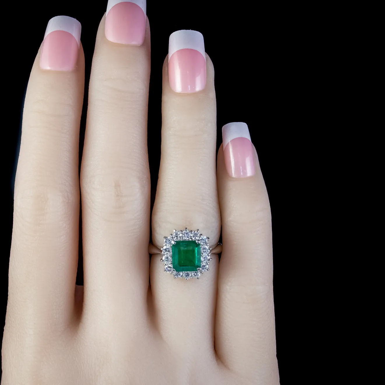 A stunning Vintage cluster ring modelled in solid Platinum and adorned with a beautiful emerald cut Emerald which has a vibrant grassy green hue and weighs approx. 2.85ct.