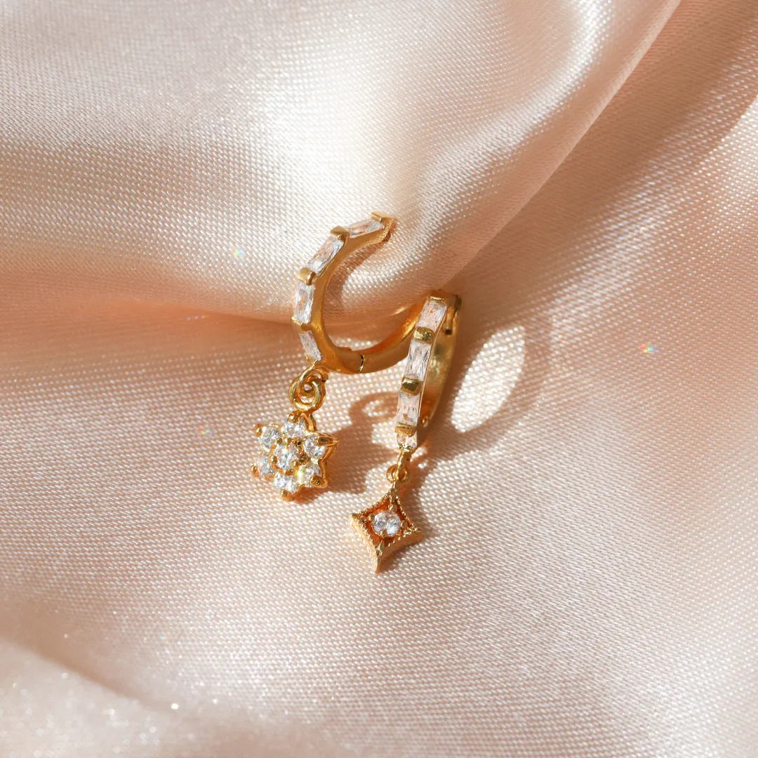 These gold dangle hoop earrings are set with cute flower charms and huggie hoop earrings. The charms and hoops shine beautifully and give you a statement look! Wear with other gold earrings to create your ear stack and enjoy mixing & matching.